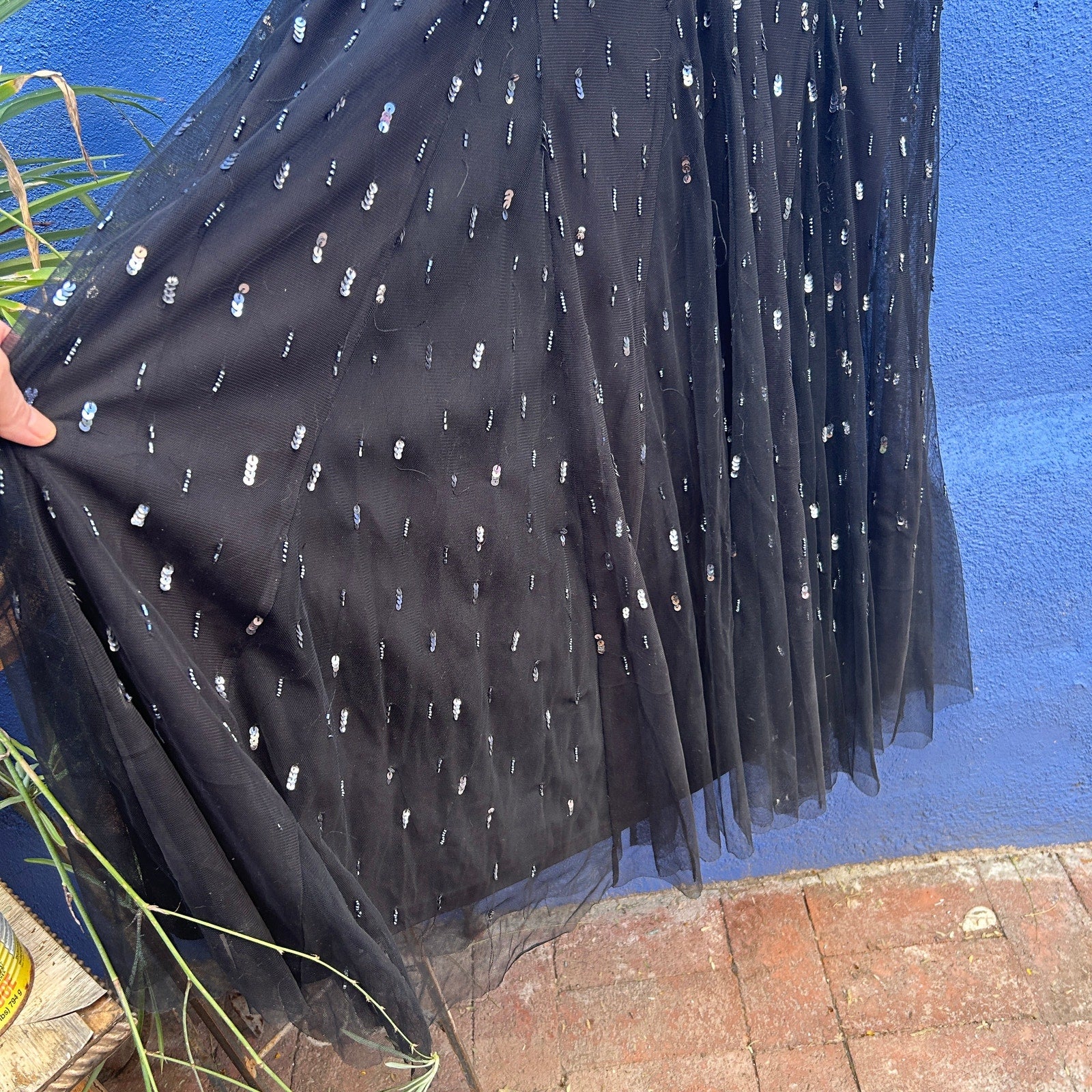 stunning nod to the 1920s / sheer cap sleeve cut / dramatic beading and sequin embellishments on a mesh tulle top layer / perfect for galas, red carpet, fancy weddings, and other notable affairs / good preowned condition with some very minor missing embellishments