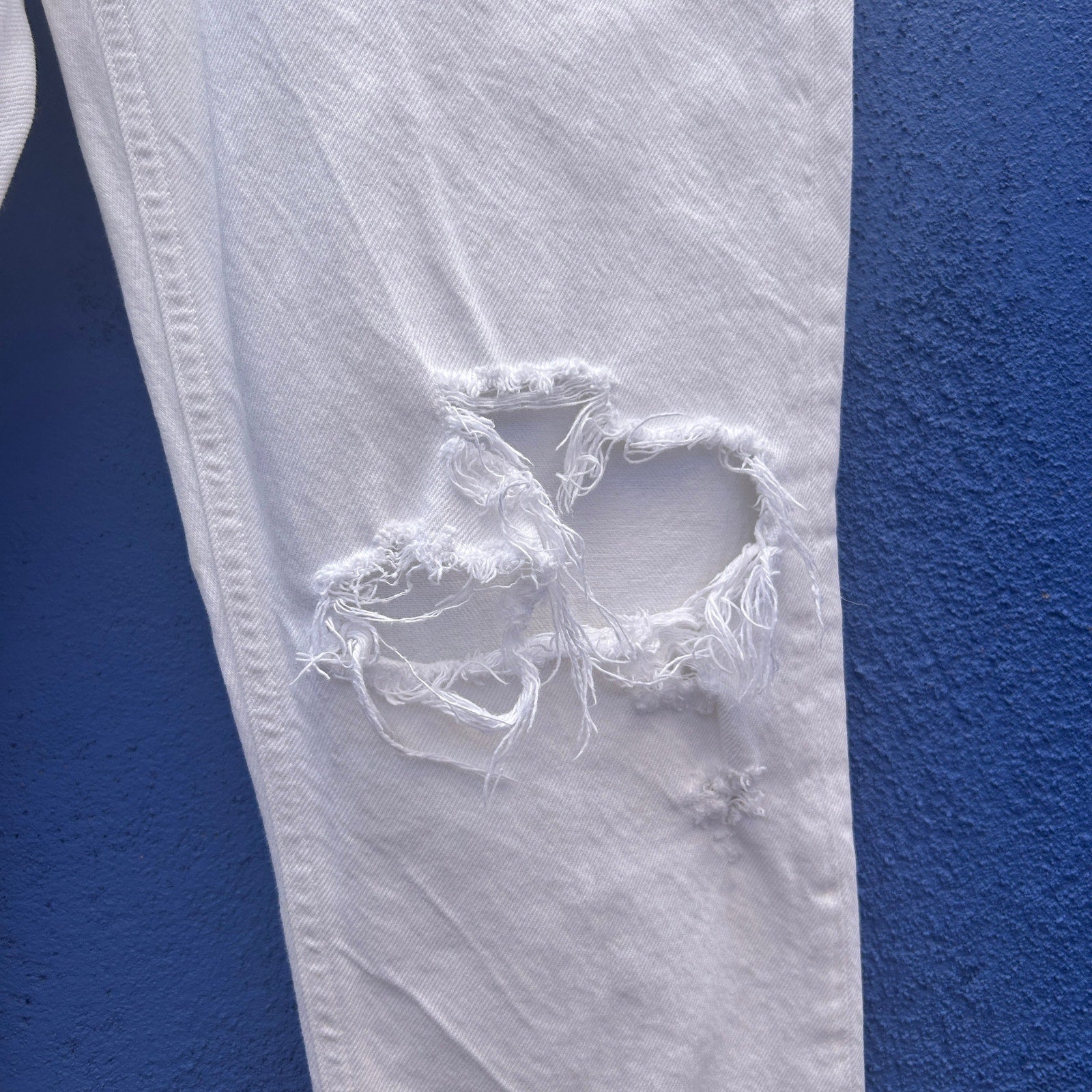 soft white organic denim / button fly / distressed at knees / high rise with a slightly tapered and cropped cut / excellent preowned condition