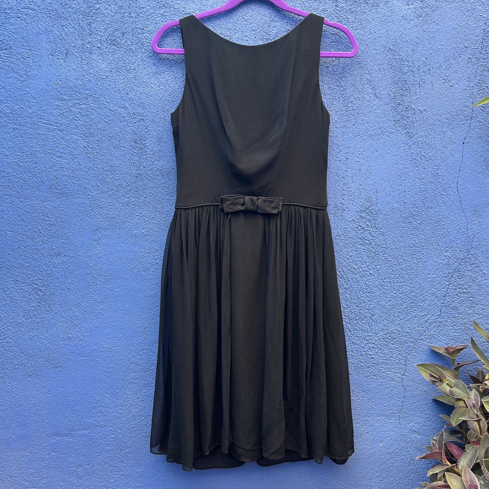 gorgeous silk with layered chiffon / attached bow detail at waist / swooped chiffon detail in back / zip closure / excellent vintage condition