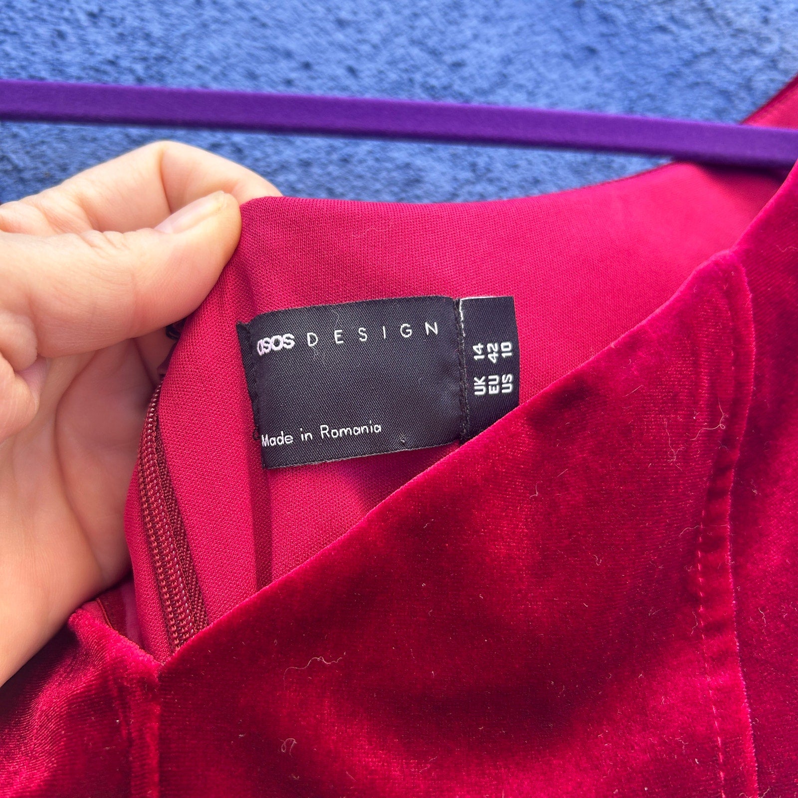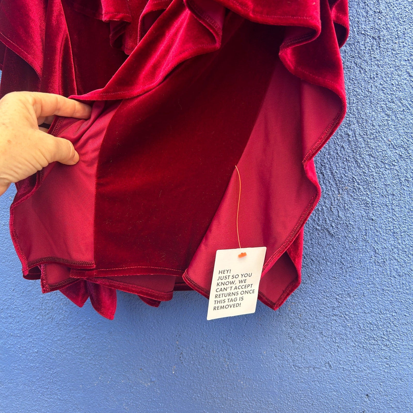 saucy, dramatic, and romantic / deep burgundy velvet in a bold design / ruffle detail on waist and sides / corset bodice cut / back zip closure / new without tags (except one for return)
