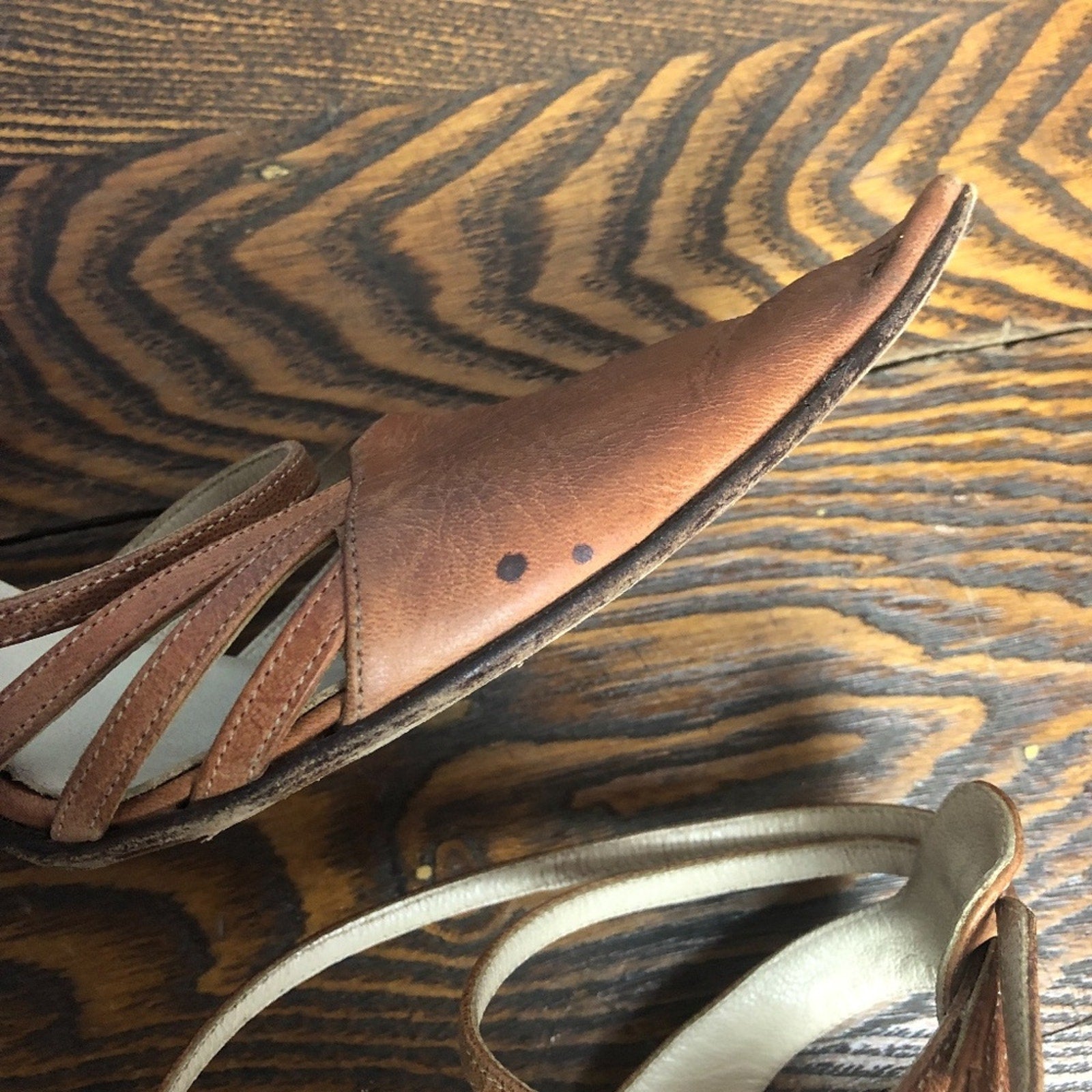 Gorgeous muted earth-tone camel leather in a unique, handmade design / Adjustable ankle strap / Great tapered block heel / Size 37 = US 8 (narrow fit) / Some wear on bottom and a few spots on the side of the right shoe (last pics), but otherwise in beautiful condition / 4" heel