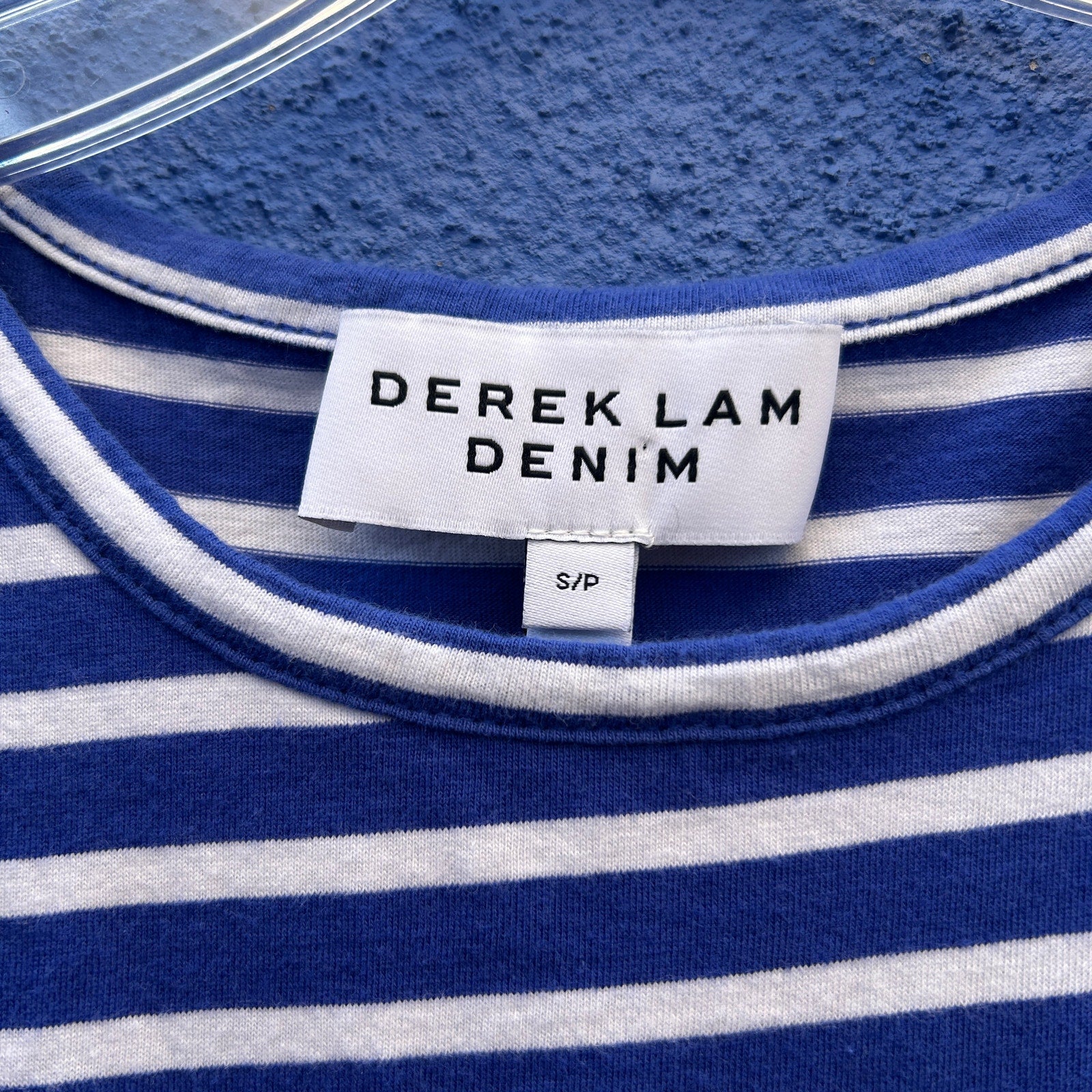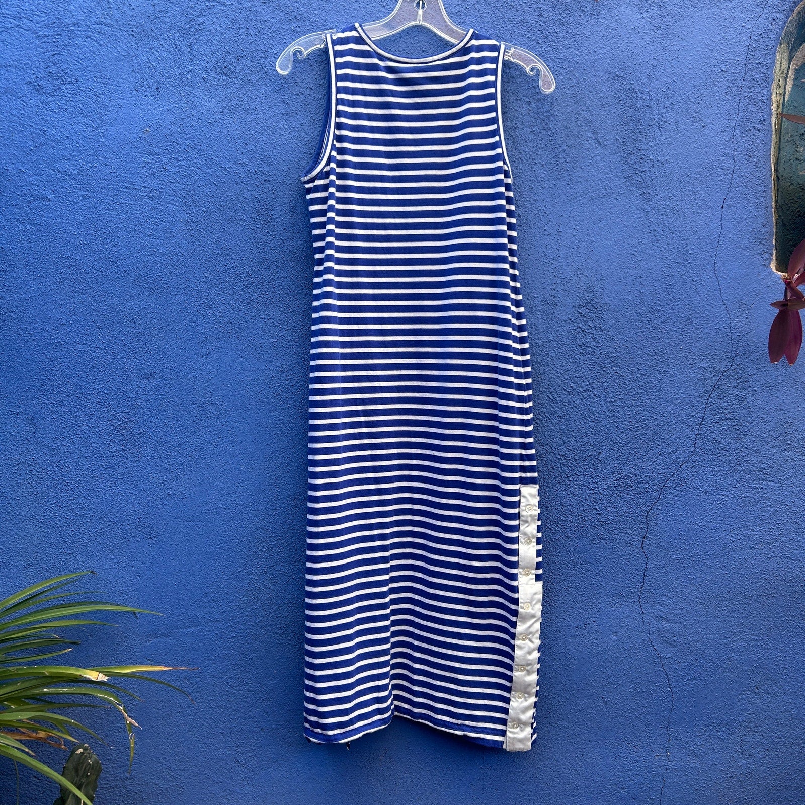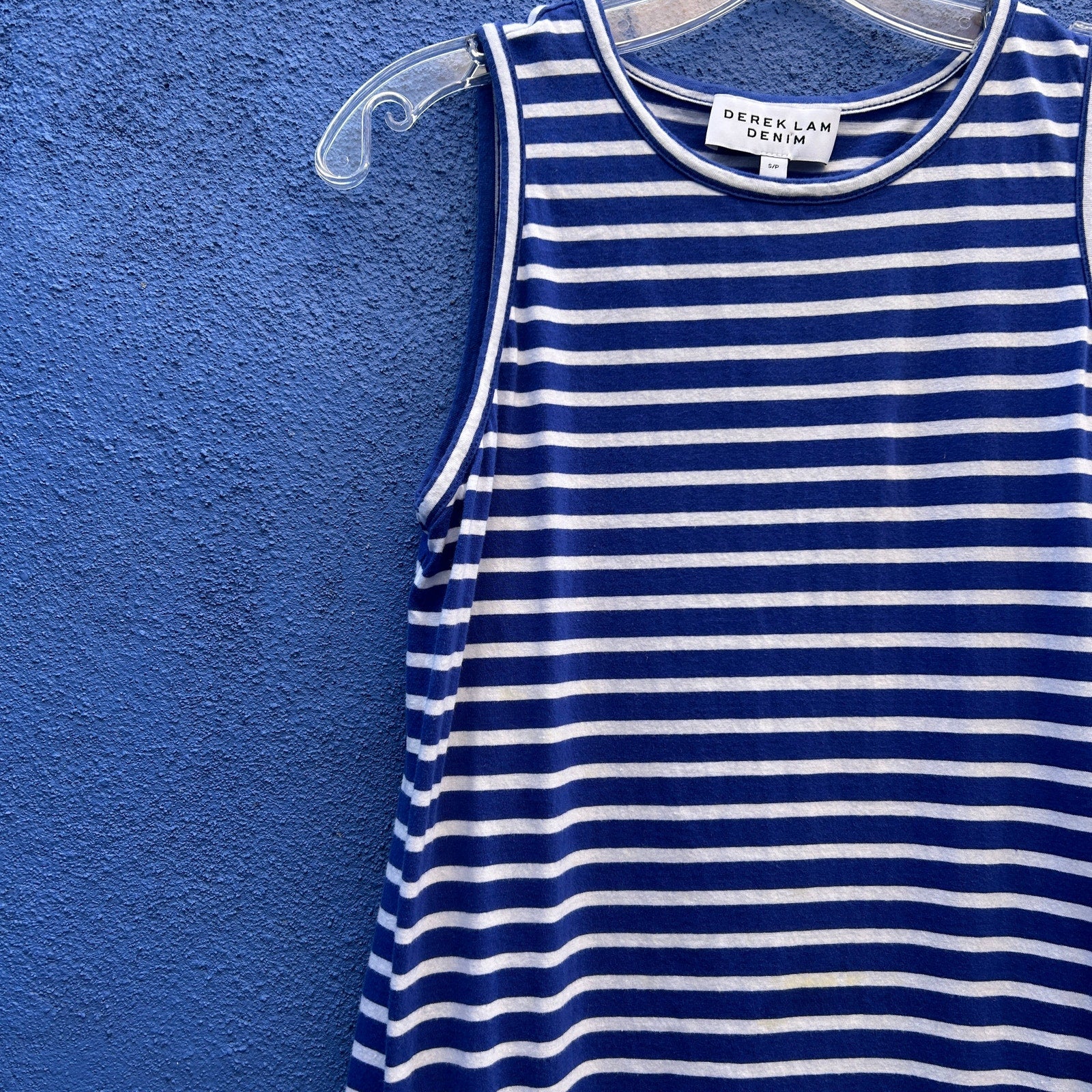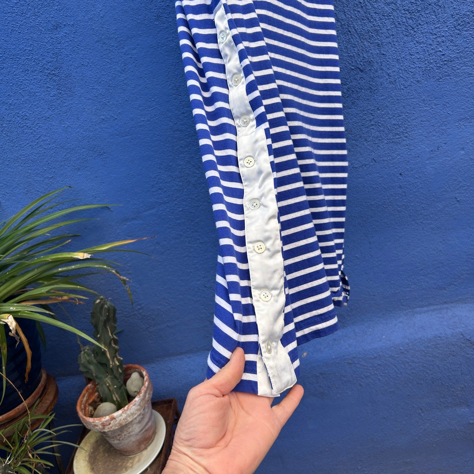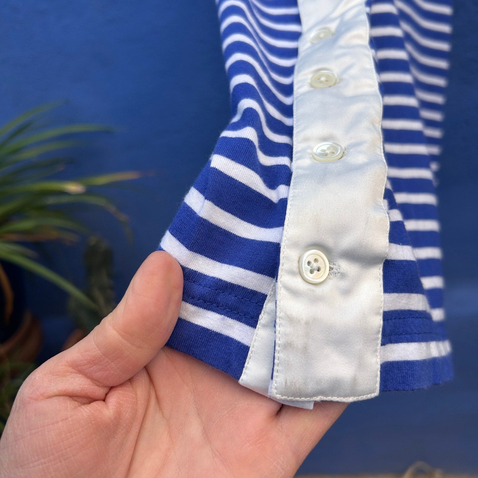 sweet, easy, and perfect for spring/summer / striped cotton with a satin and button detail at right bottom side / flirty slit on left front / popover cut / excellent preowned condition