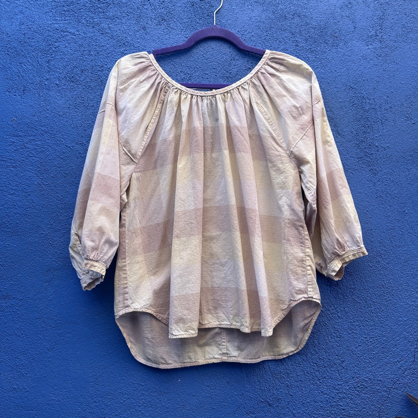 lightweight cotton in a loose-fit cut / super versatile style / muted tones / popover styling with tie at back neck / 3/4 sleeves / excellent preowned condition