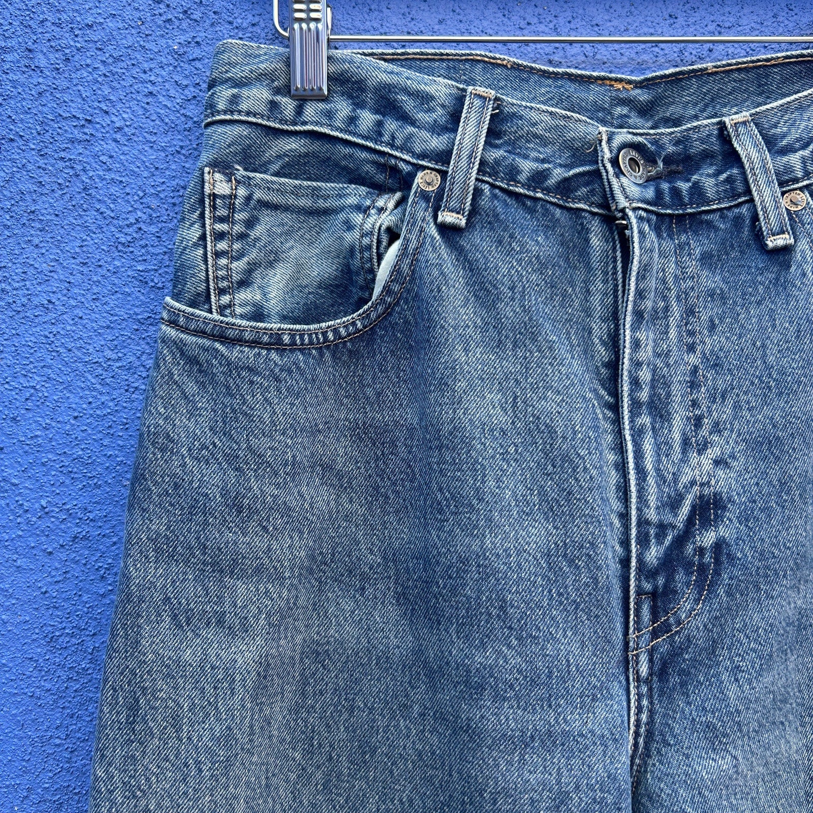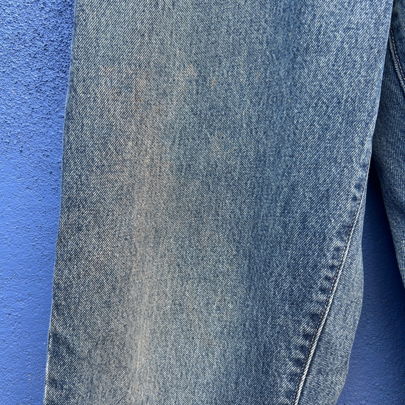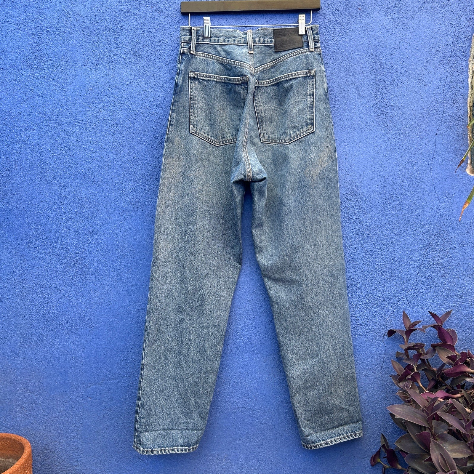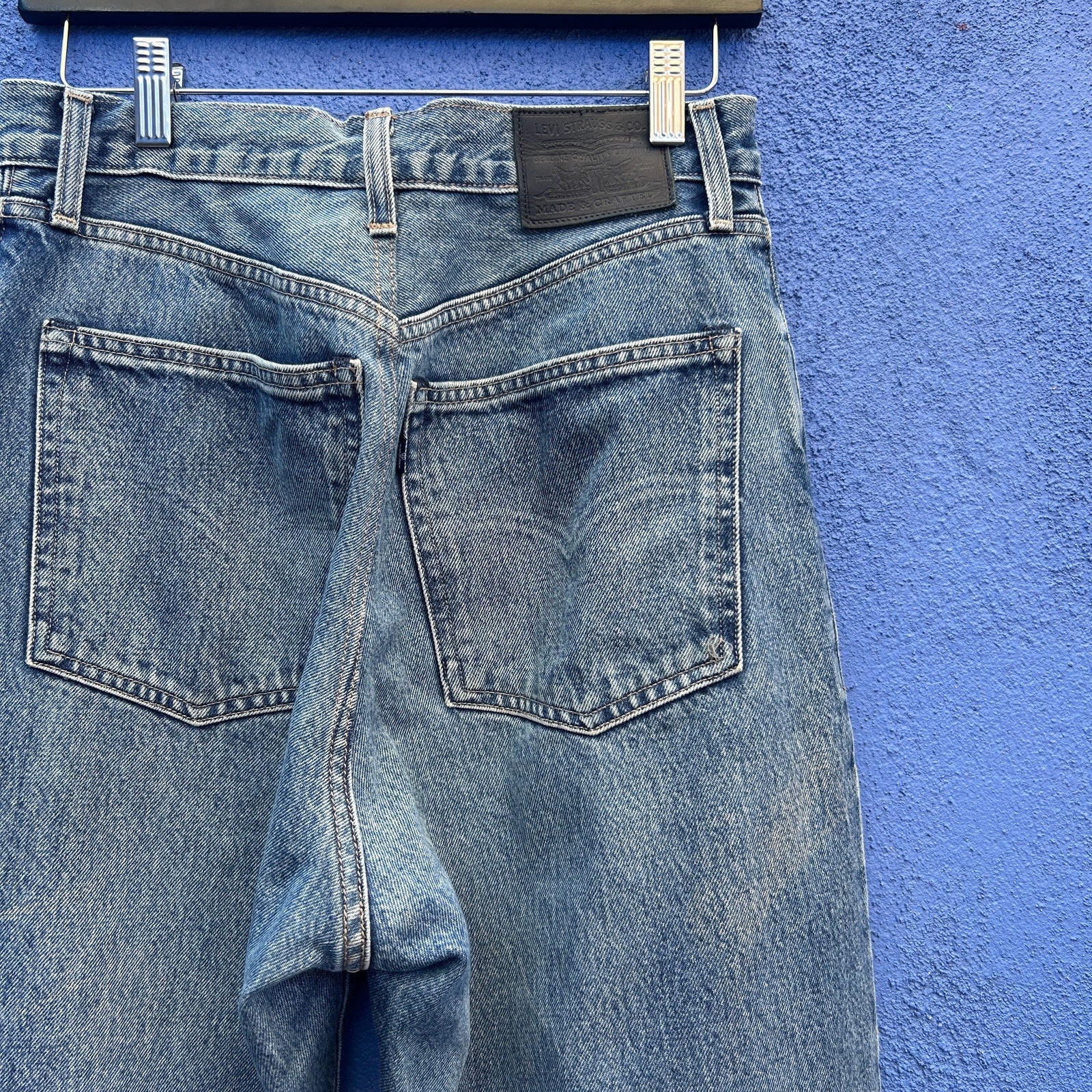 classic straight leg with a curved cut, high waist, and vintage vibes / good preowned condition with some light discoloration on the legs (could be intentional distressing, however)