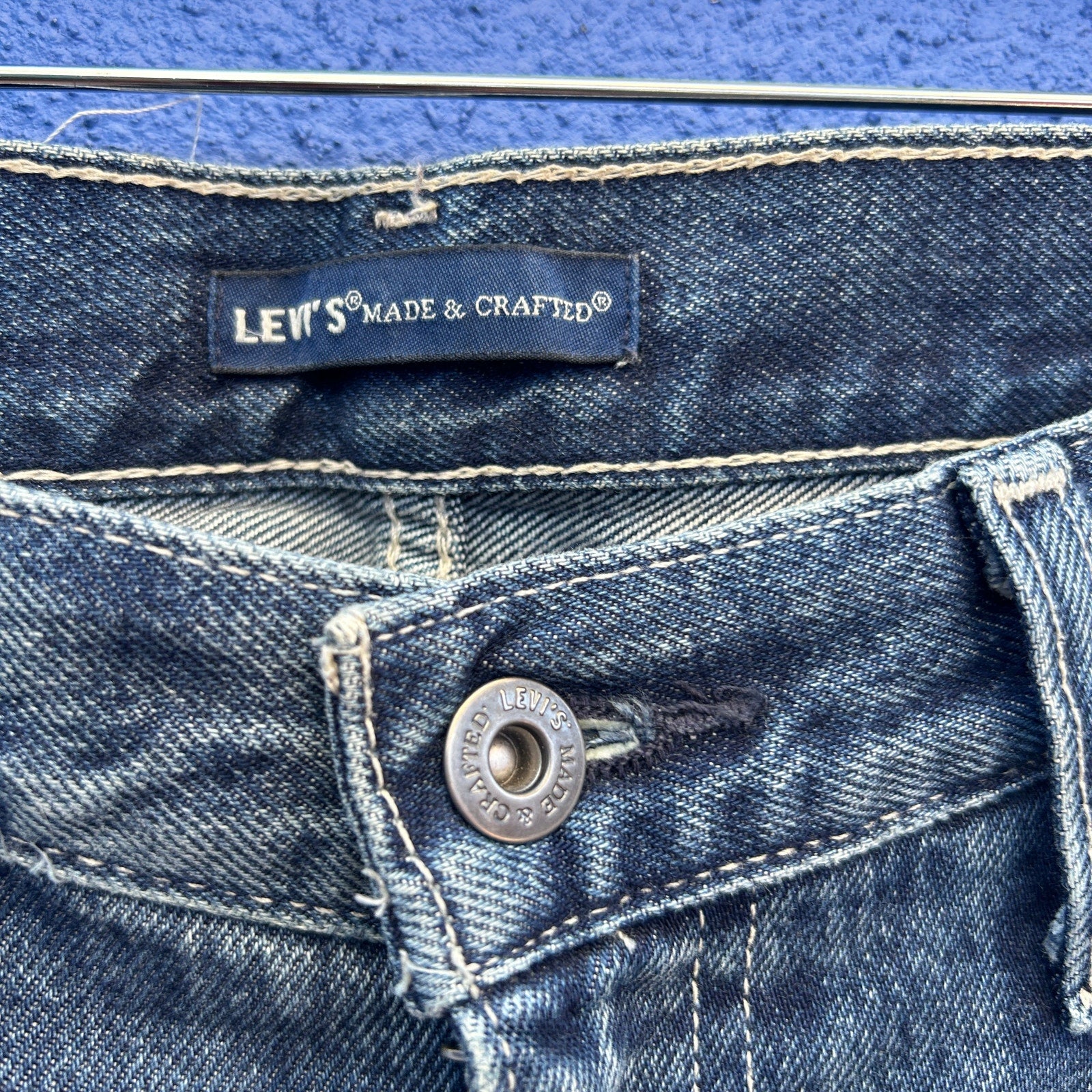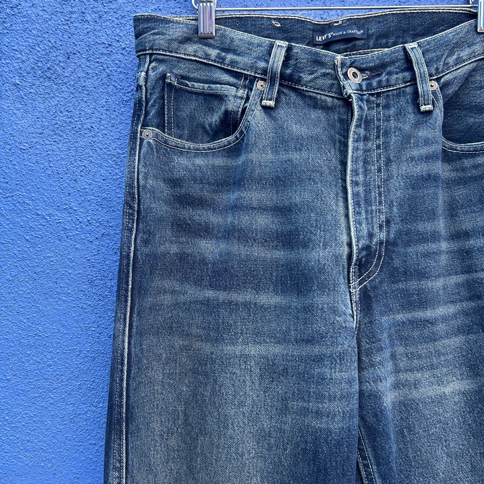 excellent remake of a classic vintage jean / great fading on a dark wash / high rise / button and zip closure / excellent preowned condition, however they have been professional hemmed