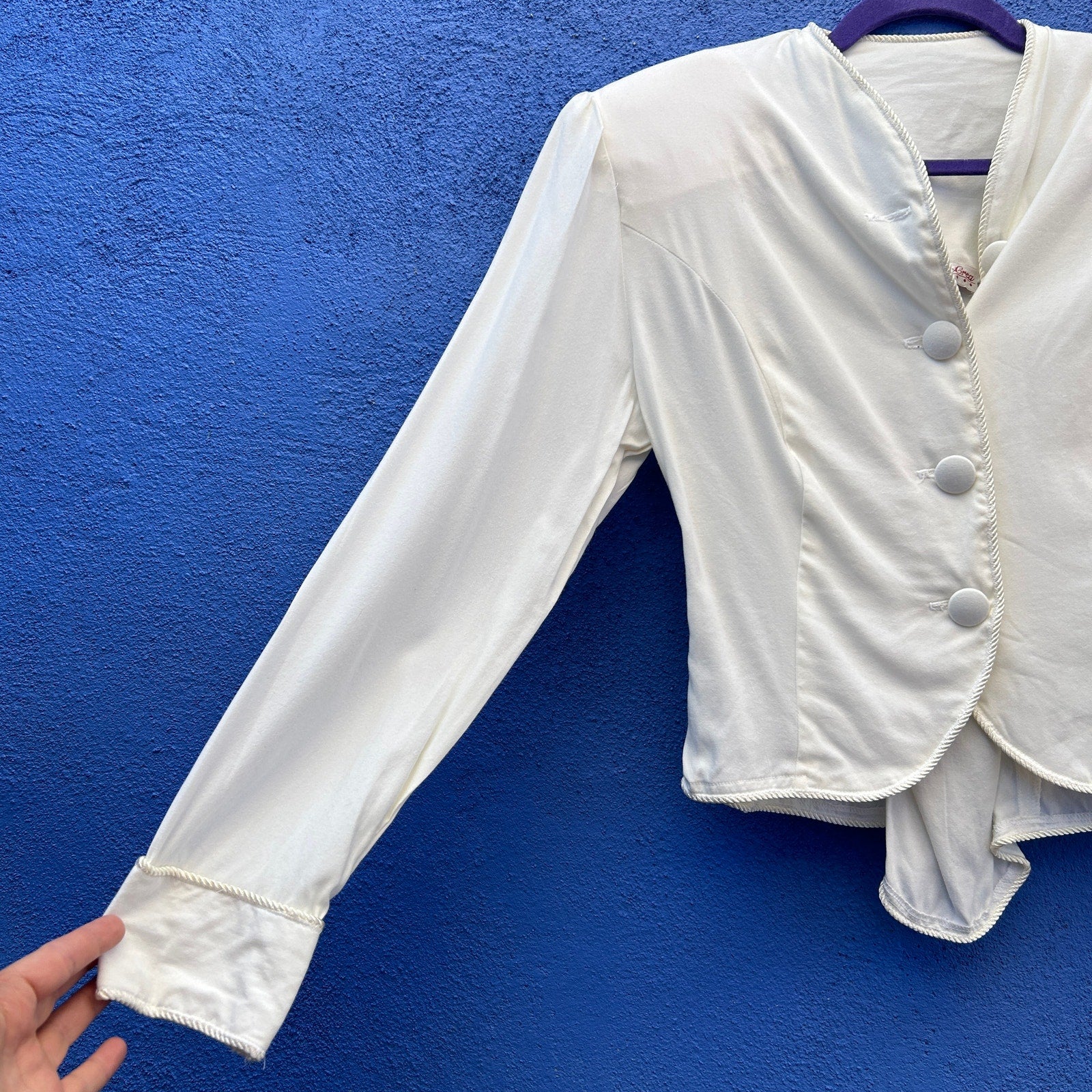 romantic and timeless / covered button front with rope cinching in back / dramatic shoulder pads / rope piping detail / excellent preowned condition