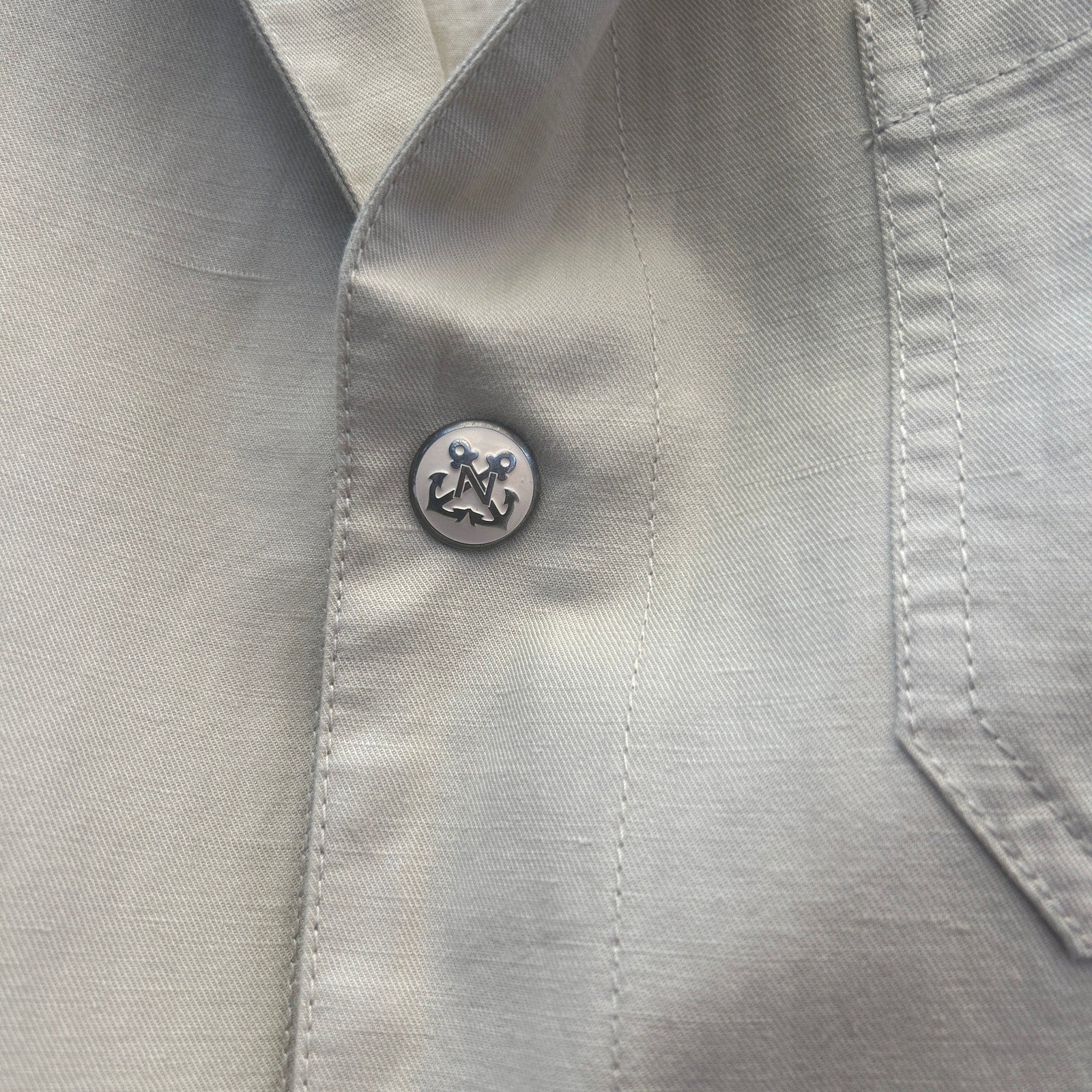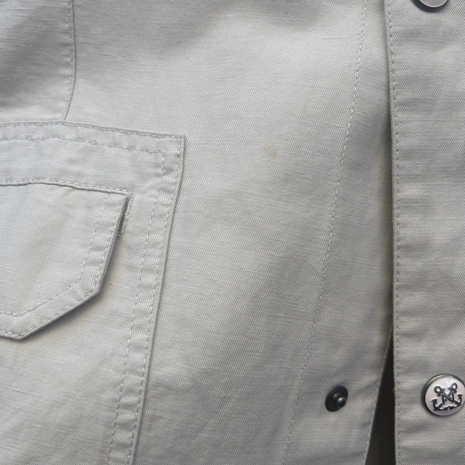 nautical theme blazer/chore coat for all your coastal needs / anchor embossed snap closure / contrast chambray on collar / good preowned condition with some faint marks noted in the last four pictures