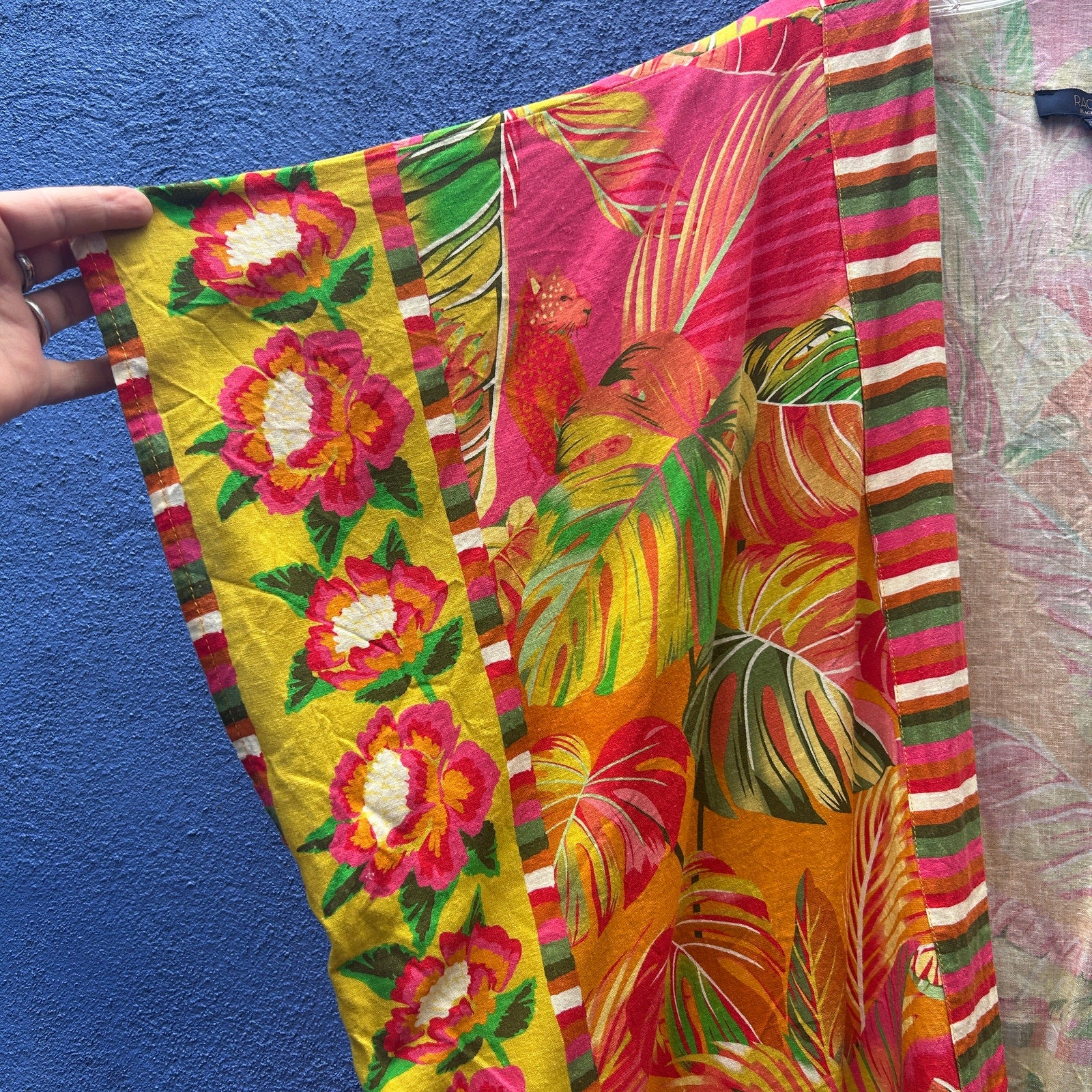 flowy and light linen/rayon blend / great for the beach, pool, or layered over your fav outfit / bold and fun / excellent preowned condition