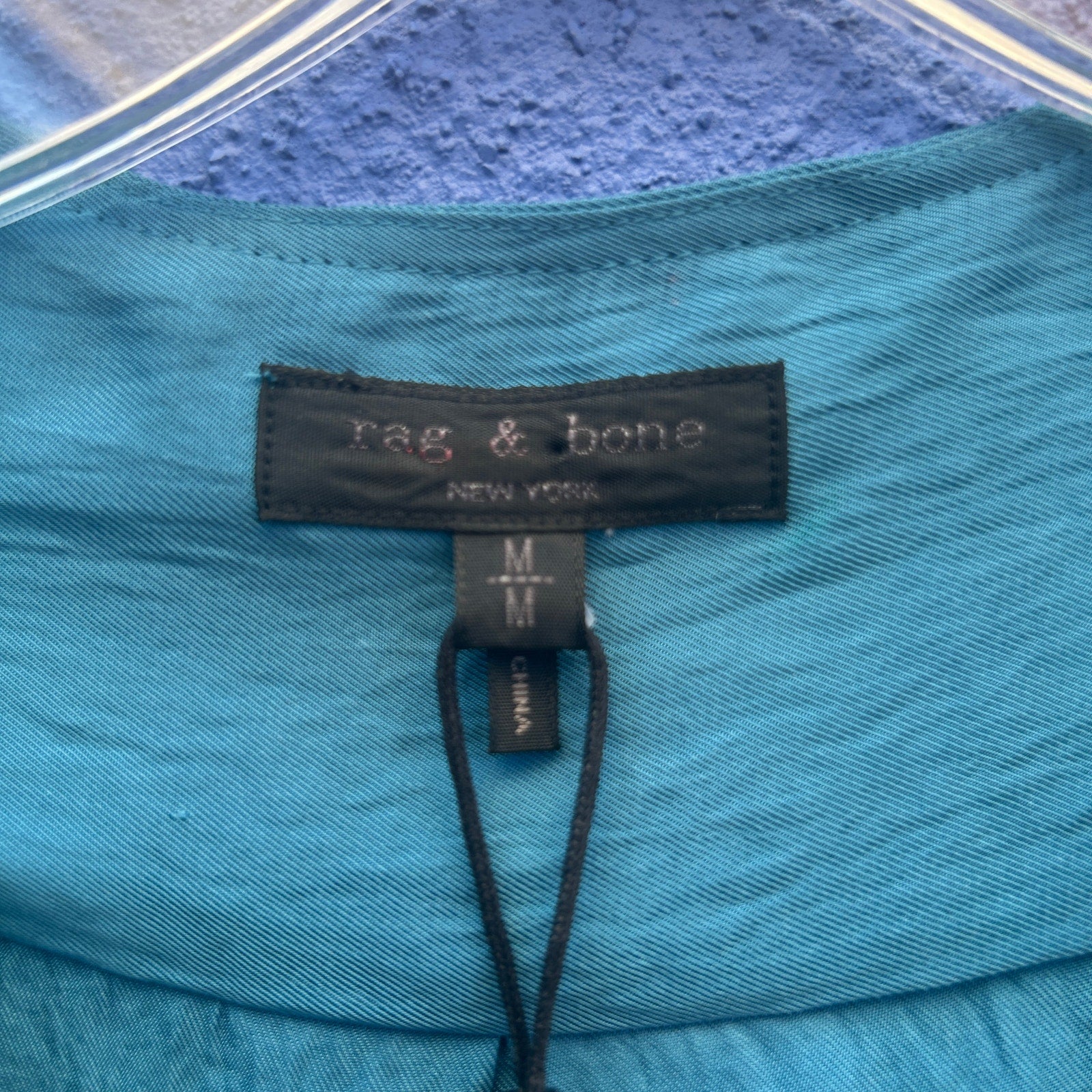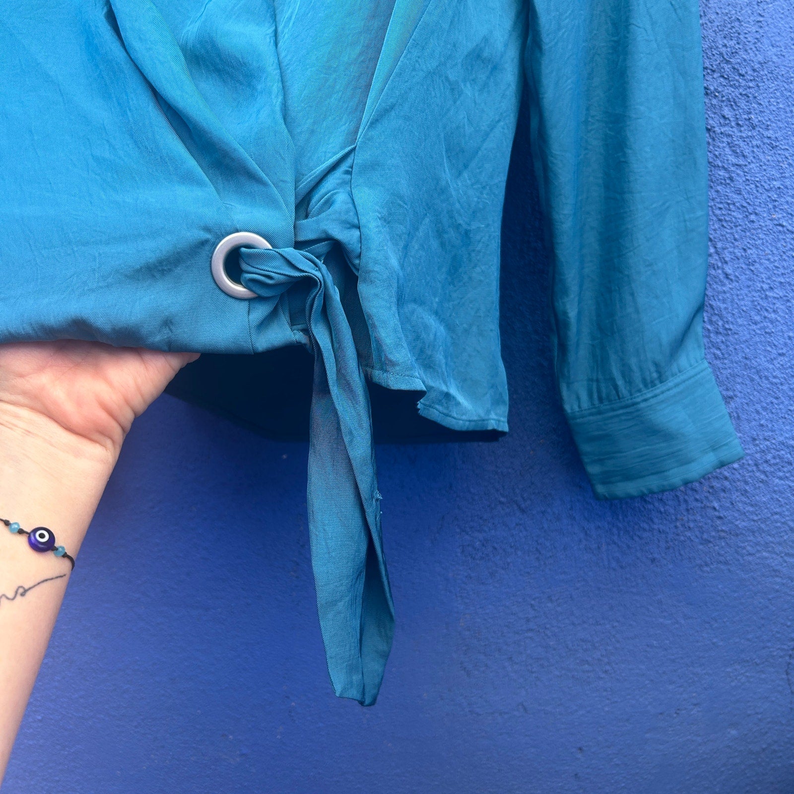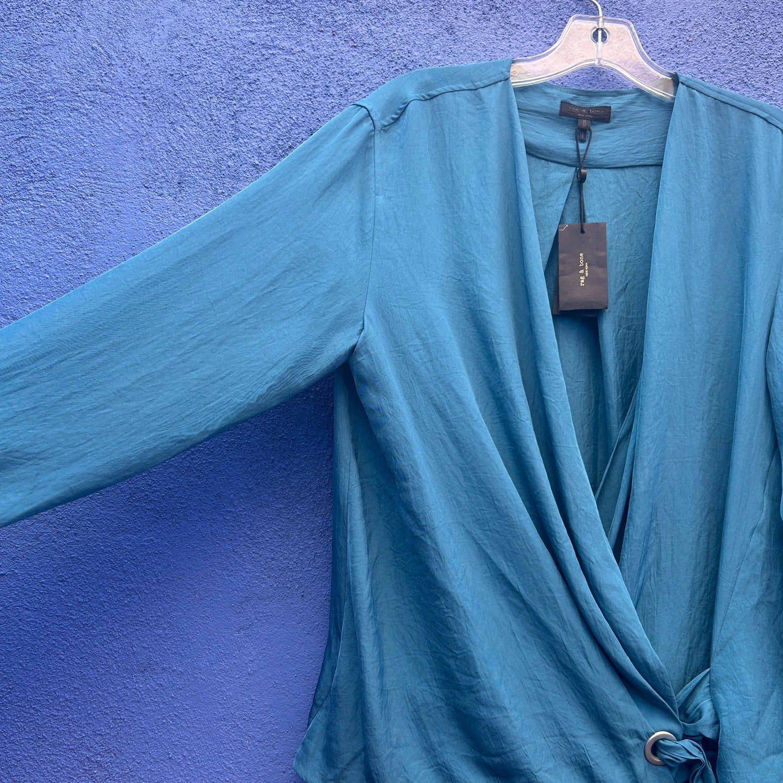 faux wrap with a snap closure at breast and grommet and tie at waist / flowing and oversized fit / yummy teal / new with tags (tag is a bit faded from storage)
