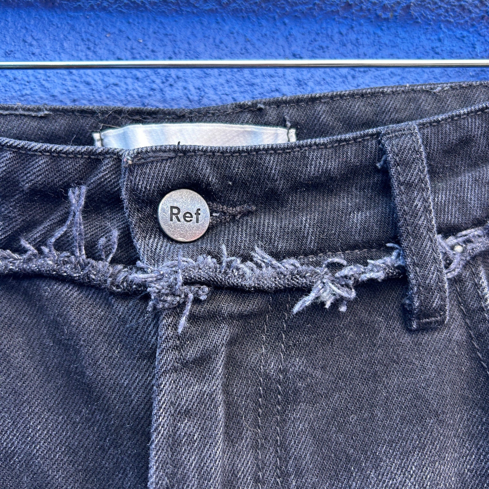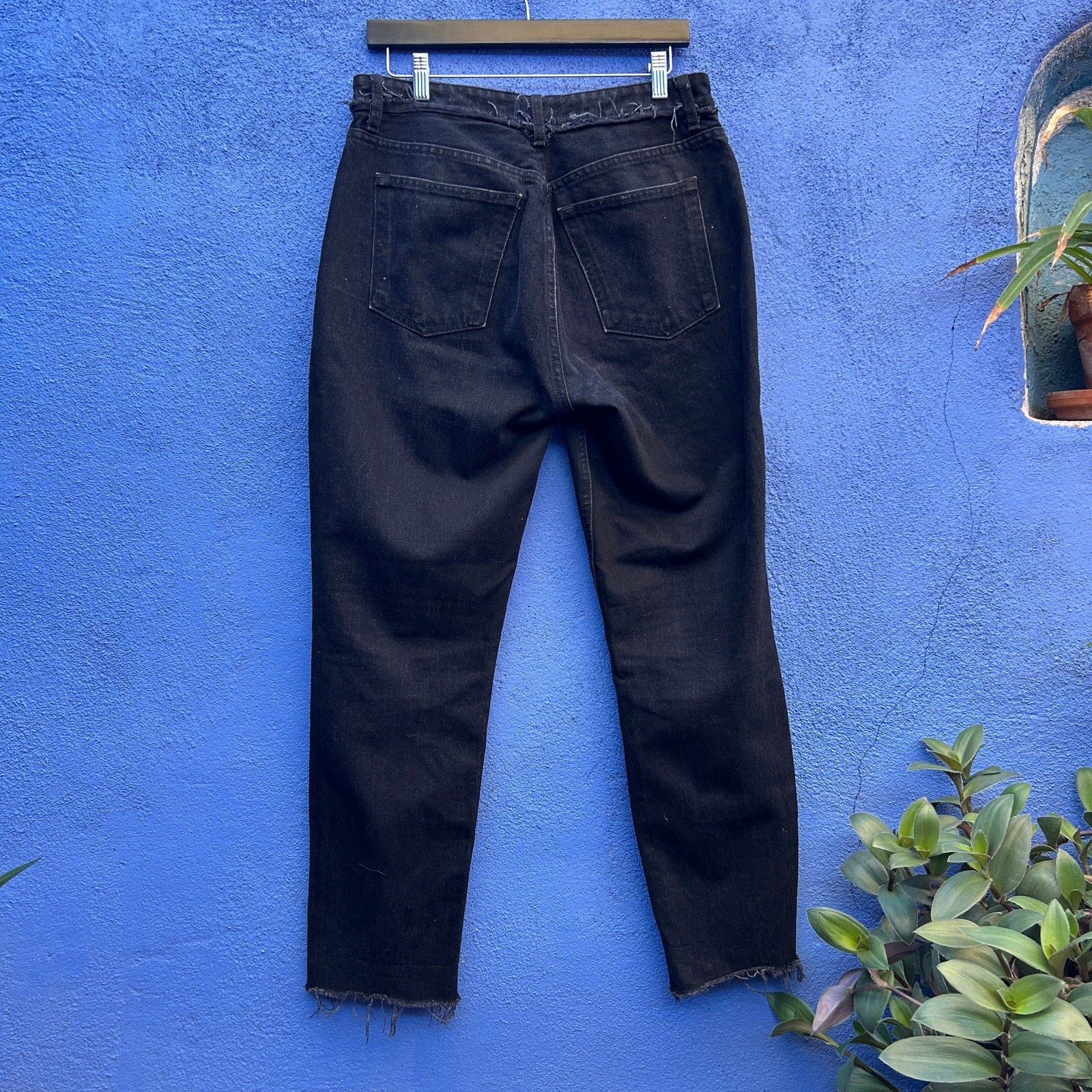 black denim with a great slight fade / distressing at waist and hem / excellent preowned condition