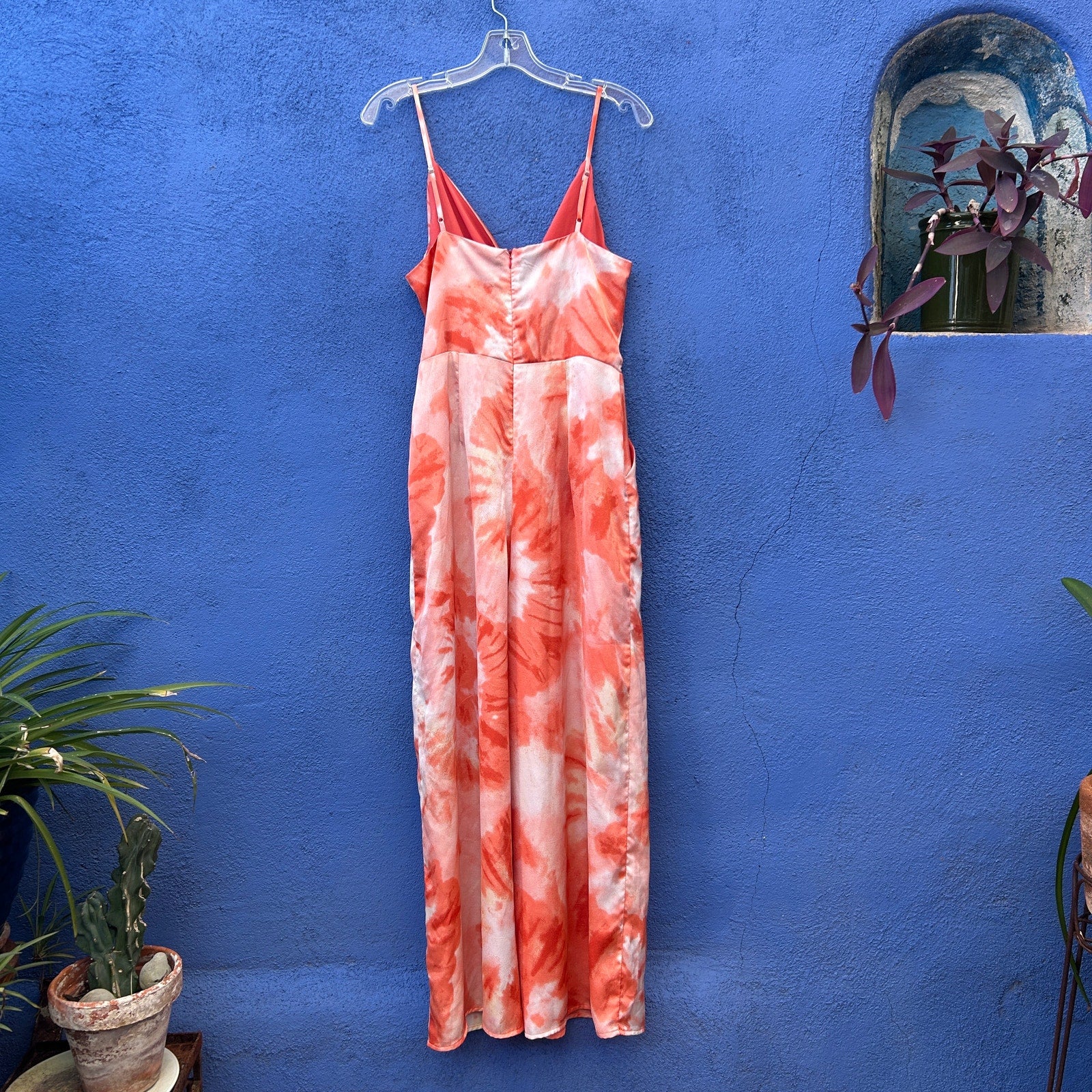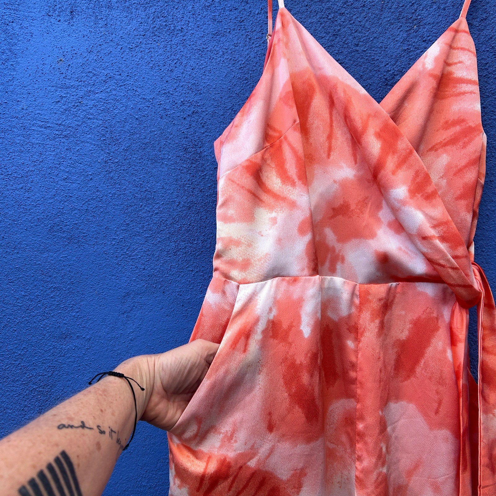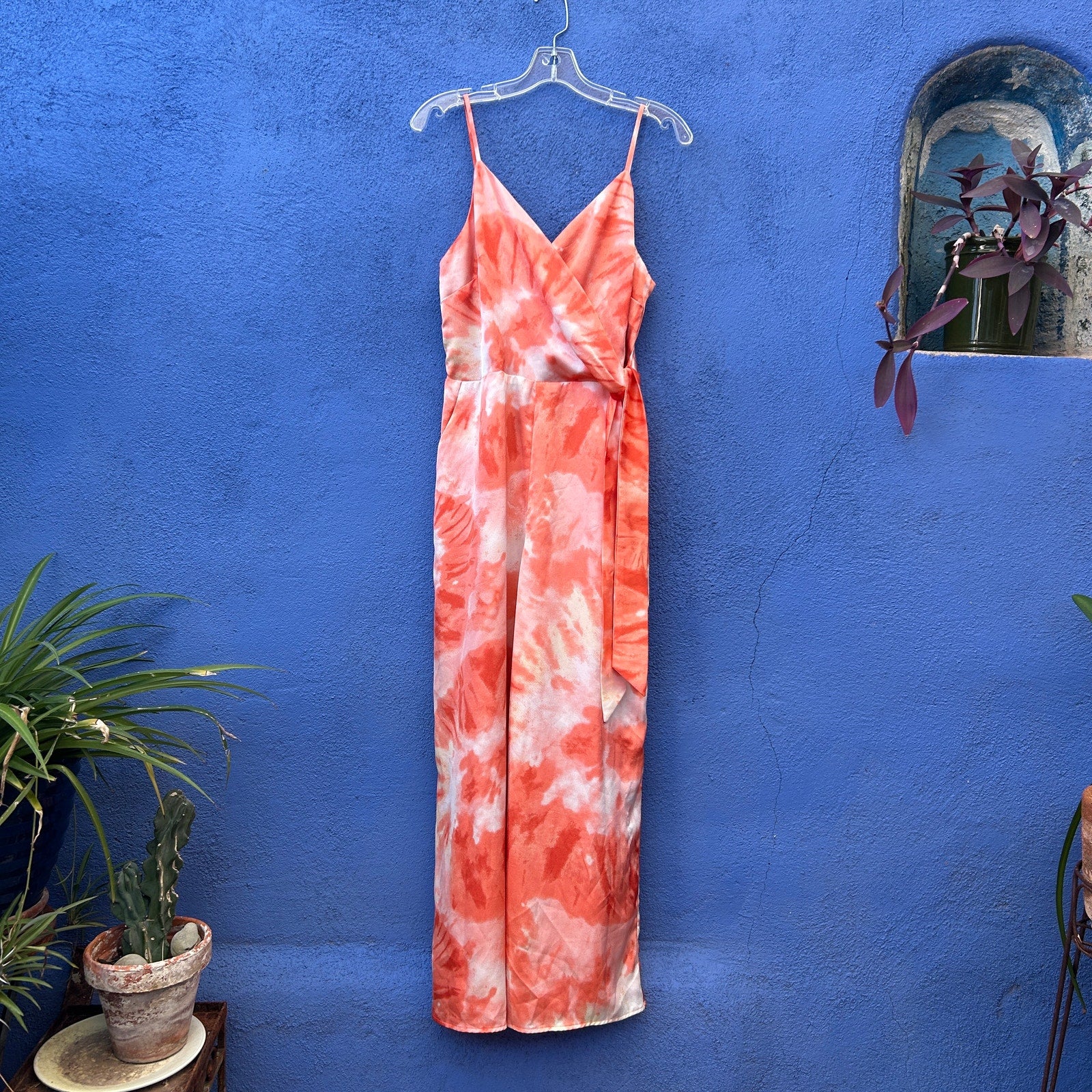 flowy and fancy with an almost tie dye flair / faux wrap top / back zip closure / wide leg cut / side pockets / lined / adjustable straps / excellent preowned condition