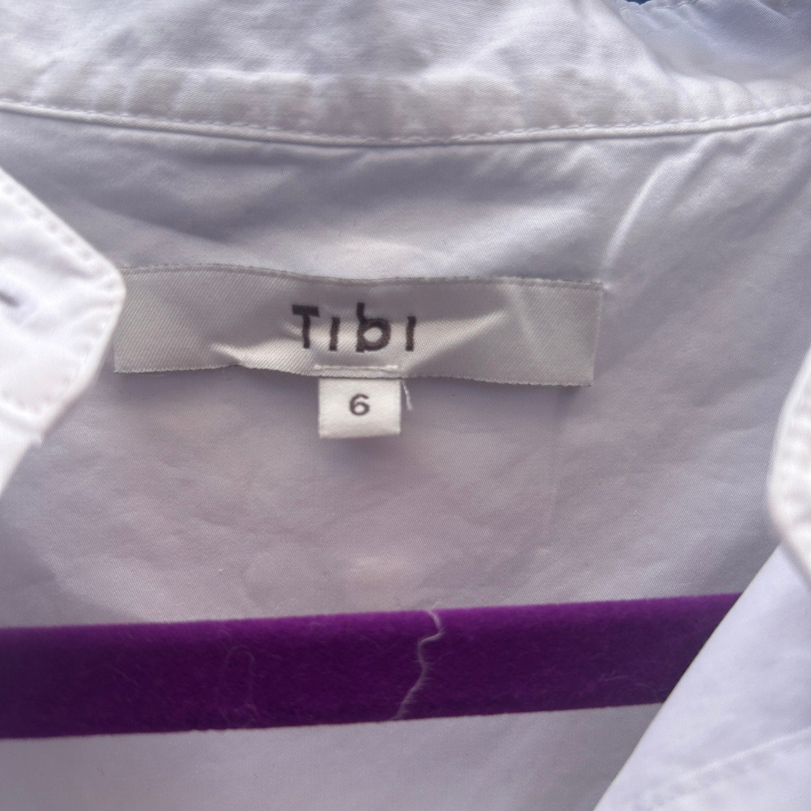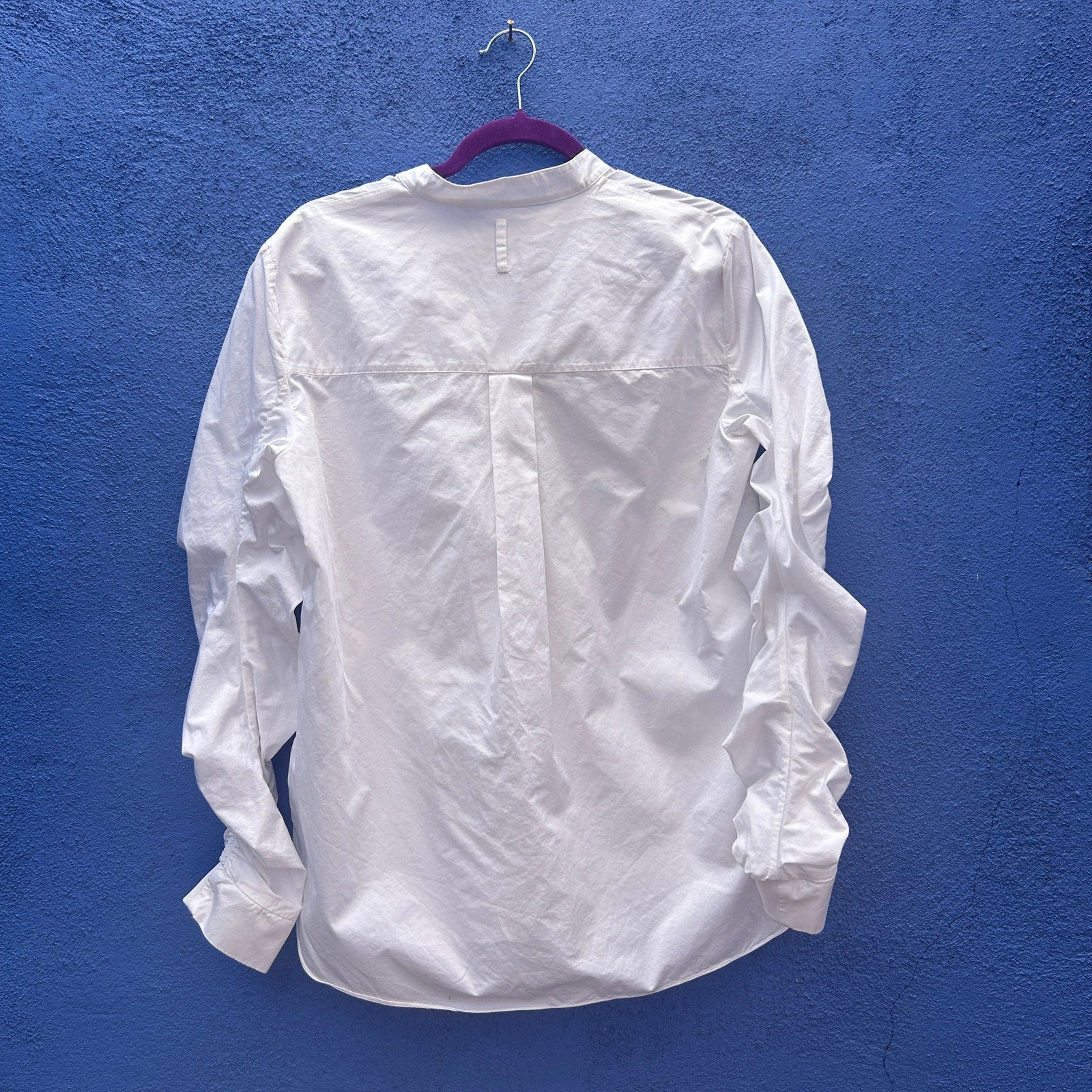 a bold take on a classic style / mandarin collar / elastic sleeve ruching / ribbed stretch cuff detail / shirttail hem / excellent preowned condition