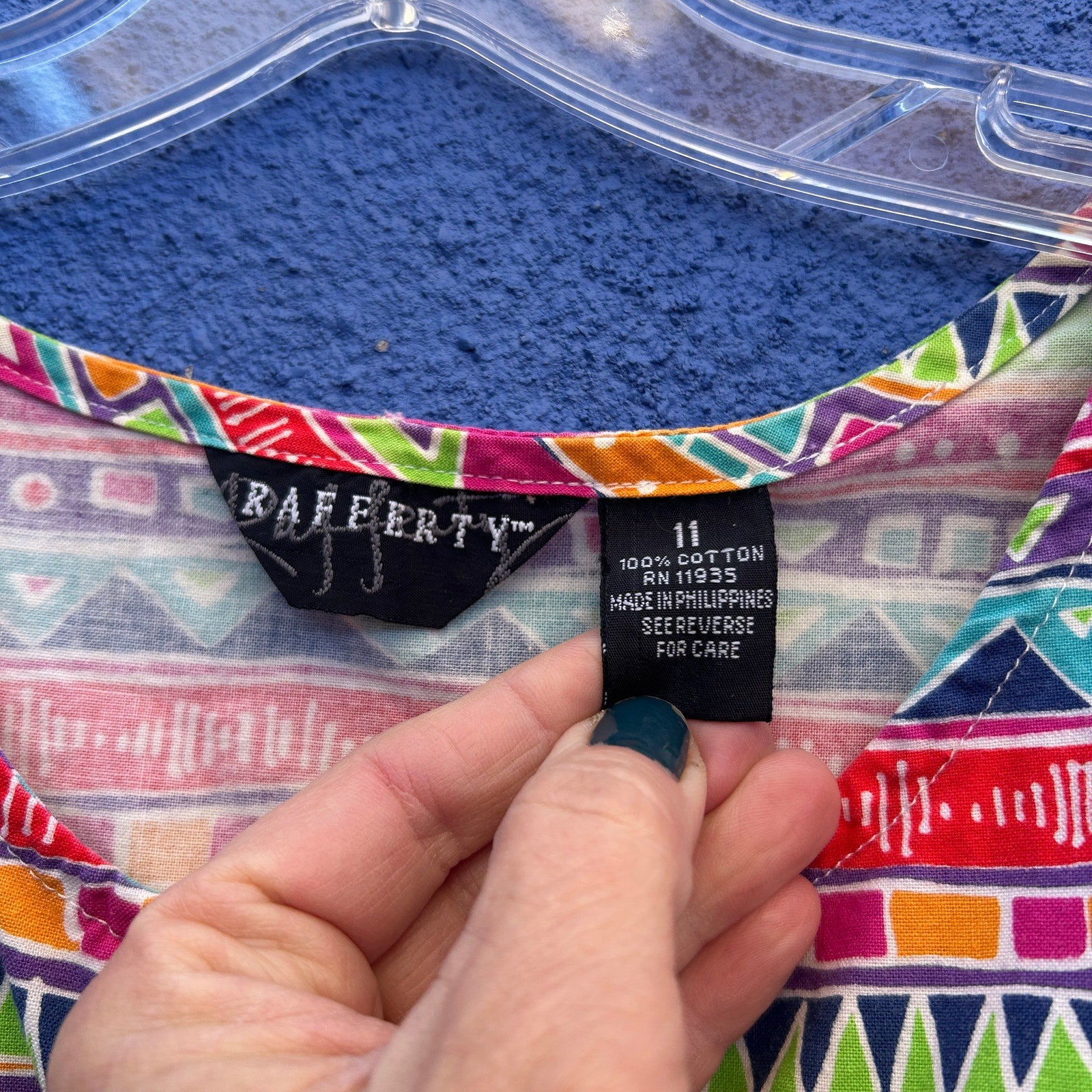 bold and bright mixed geometric print cotton with 80s flair / drop waist cut / 8 button neckline / excellent preowned condition