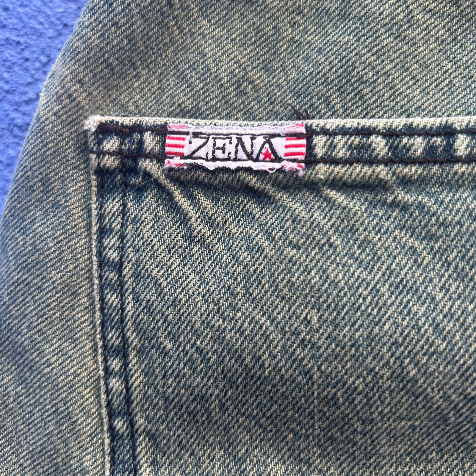 fun broken in throwback / faded wash with a yellowish-green hue / great stitch detail at pockets / perfectly worn-in condition