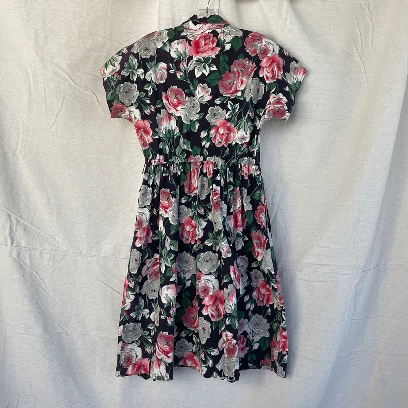 Union Made and super cute / Button front with faux double button detail / Shoulder pads / Short dolman sleeves / Pockets / Good preowned condition - missing thread for hook at waist and slight sun fading on left shoulder (last pictures) / No side tag, listing as medium based on measurements / Belt loops on sides, but no belt included / Cotton blend