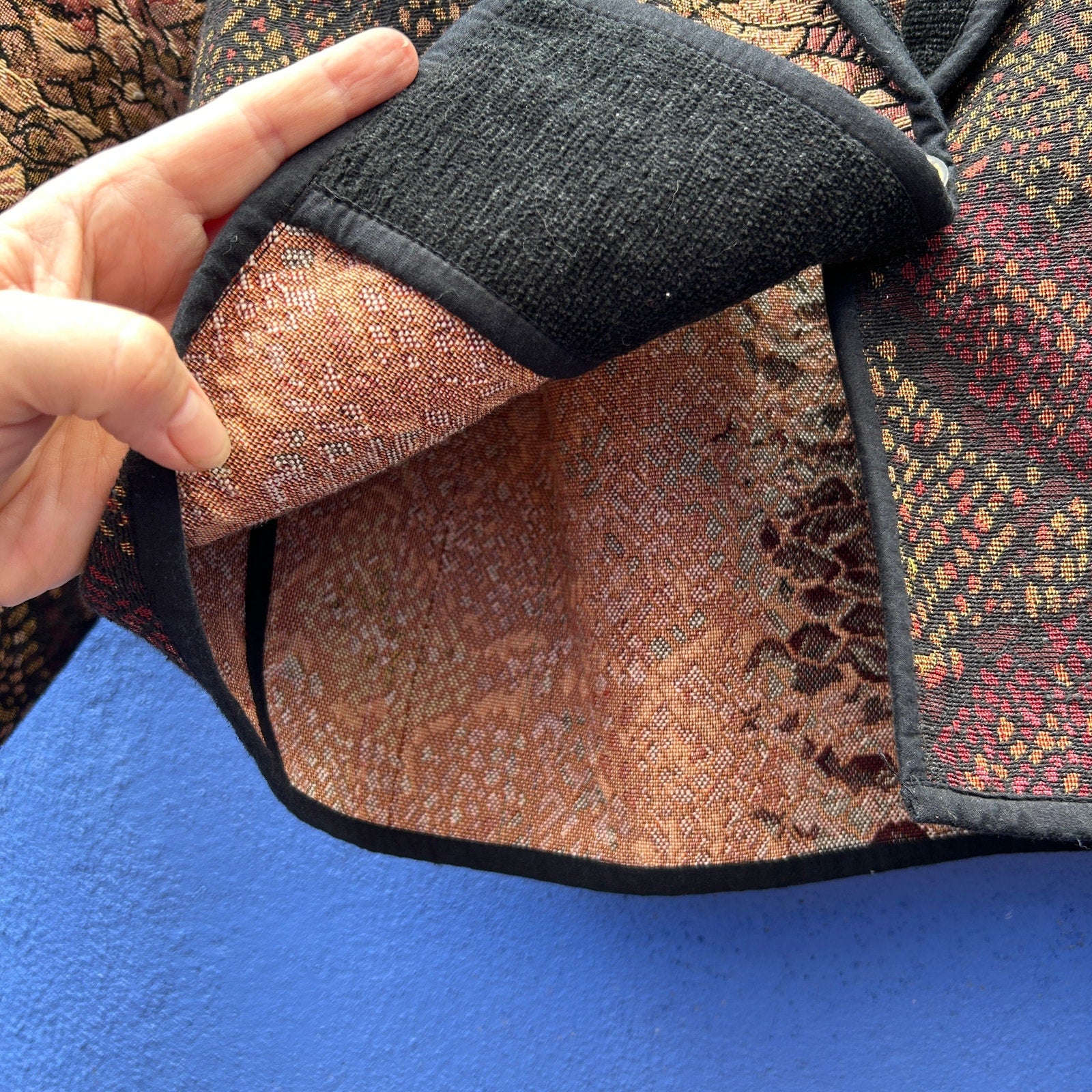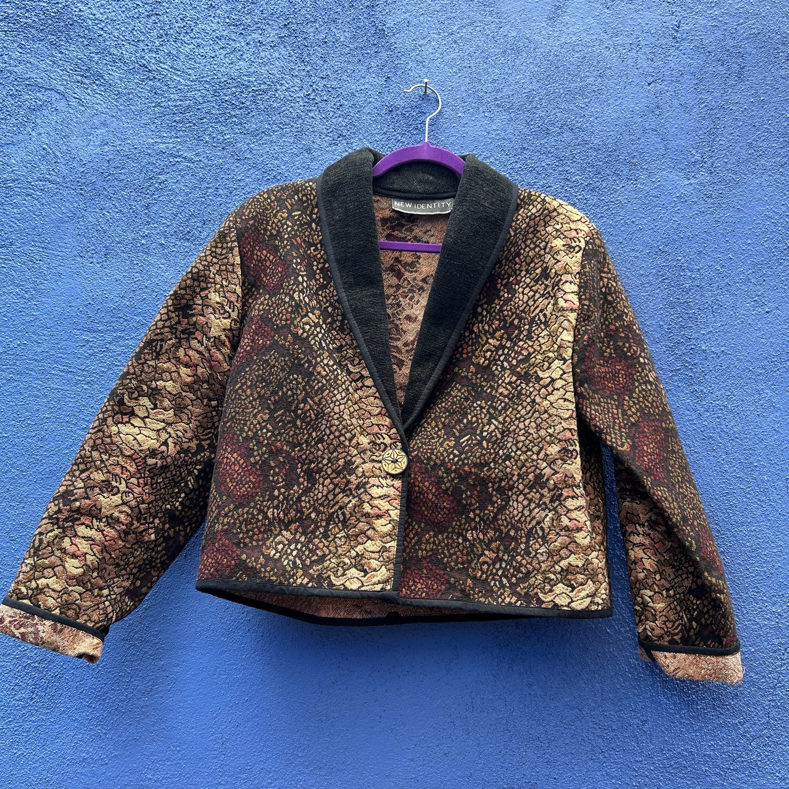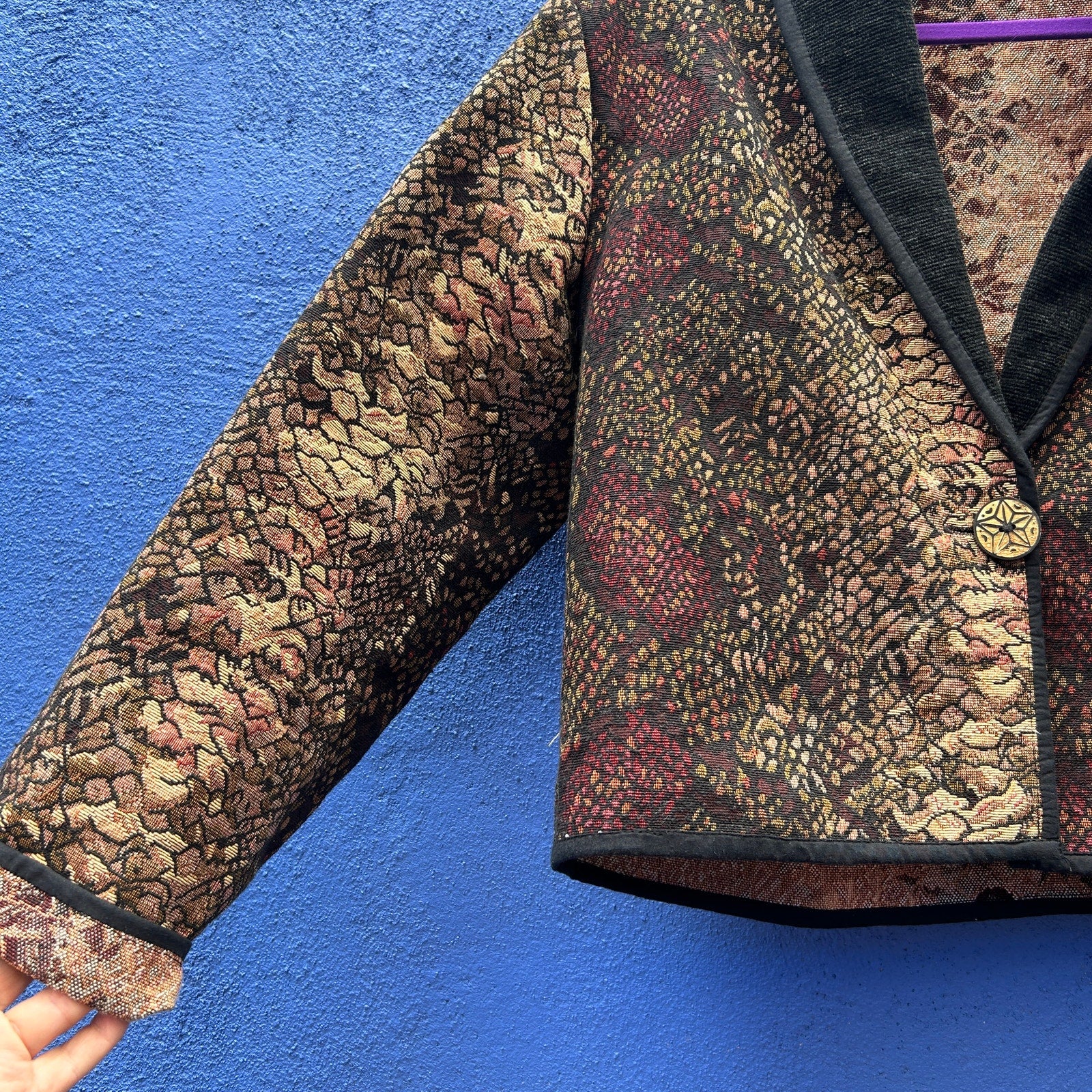 bold and unique / one wood star button closure / great for lagenlook styles / textured, lighter weight tapestry fabric with almost a metallic hue / soft velvety cord collar / structured design and oversized fit / excellent preowned condition