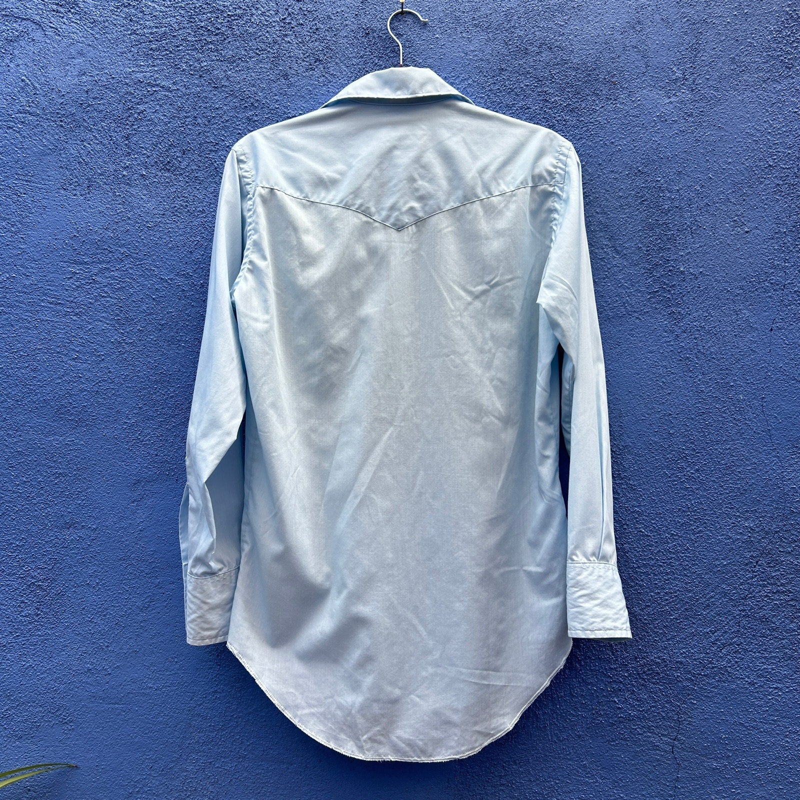 cool light blue poly-cotton blend / mother-o-pearl blue hue snaps / excellent vintage condition