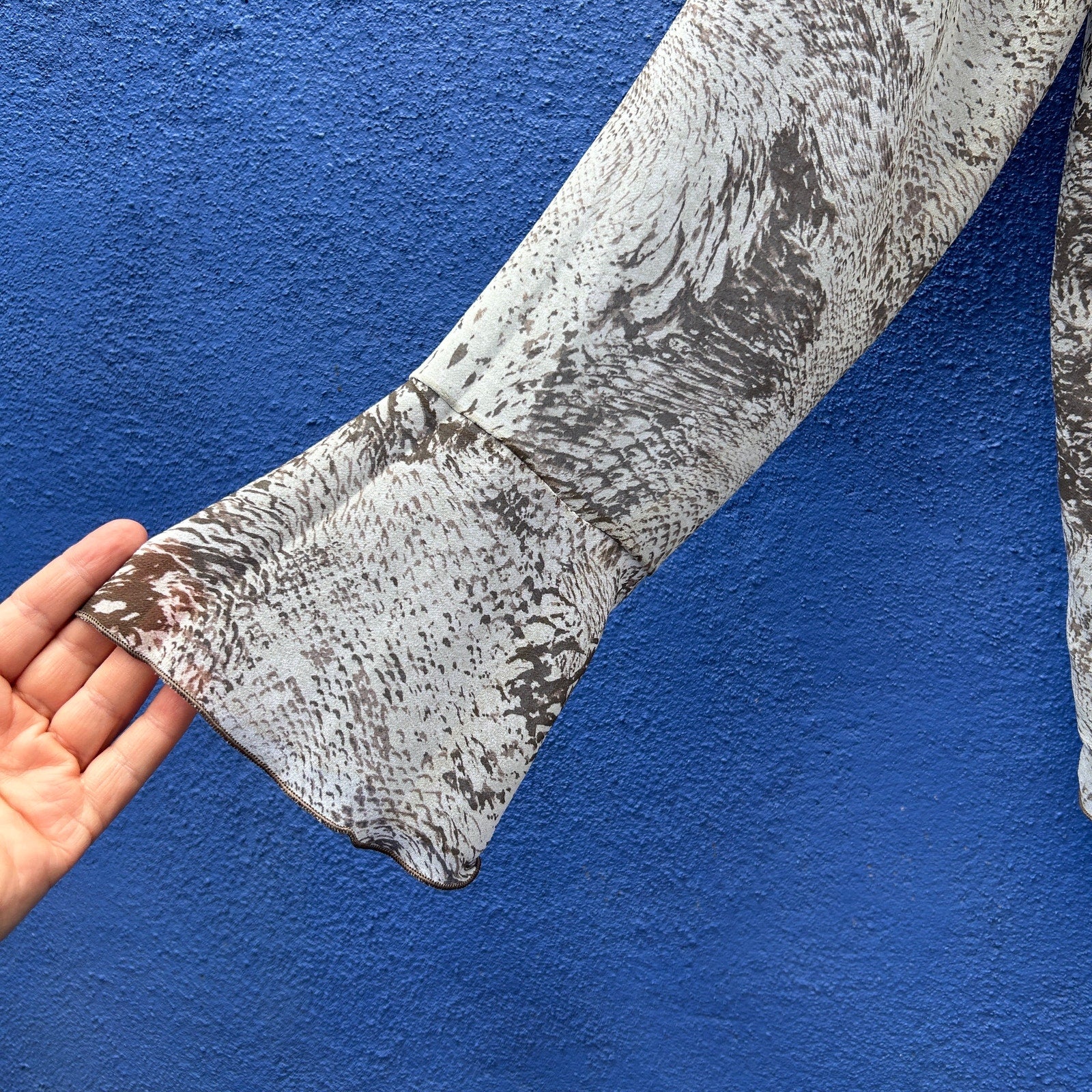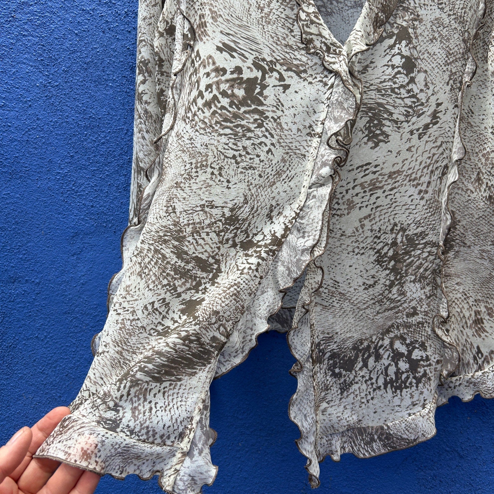 oversized fit / loose, jacket style cut - perfect for layering / ruffle accent along neckline, torso, and cuffs / mixed animal print with mostly a snakeskin feel / excellent preowned condition
